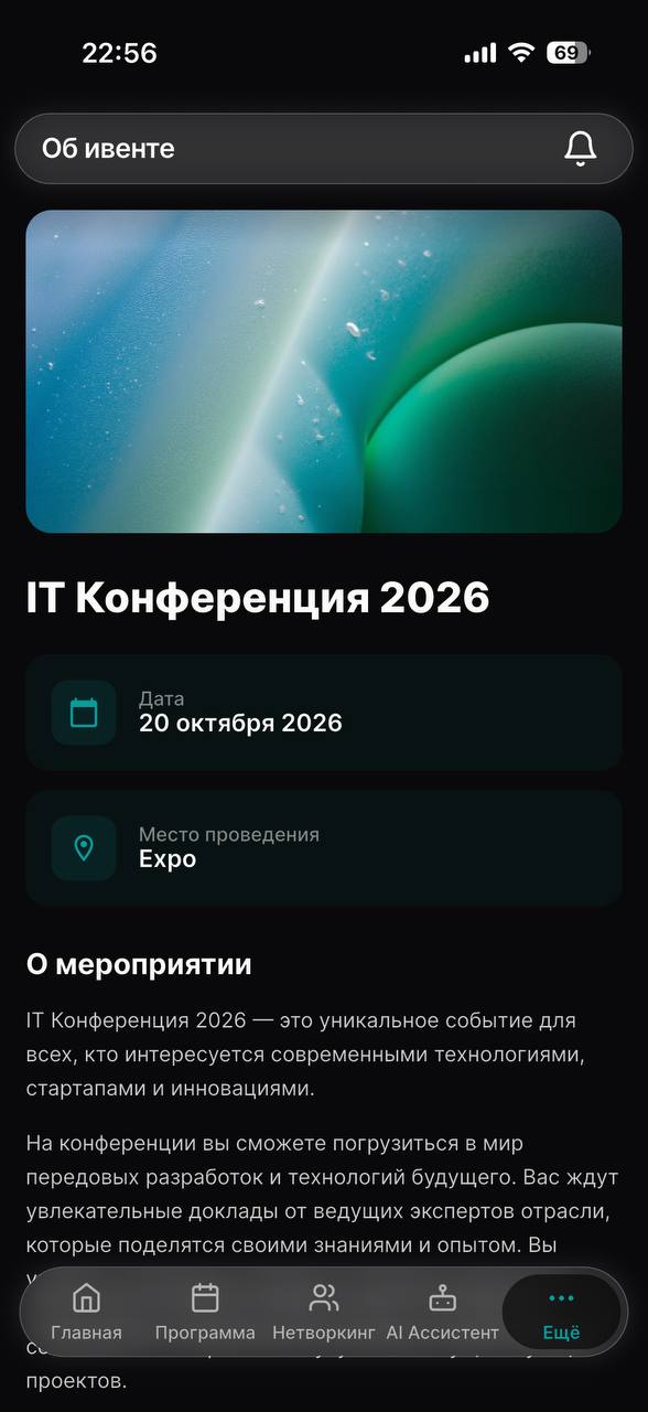 Веб-версия и нативное мобильное приложение с AI-рекомендациями людей и сессий, мессенджером, системой встреч и всей информацией об ивенте.