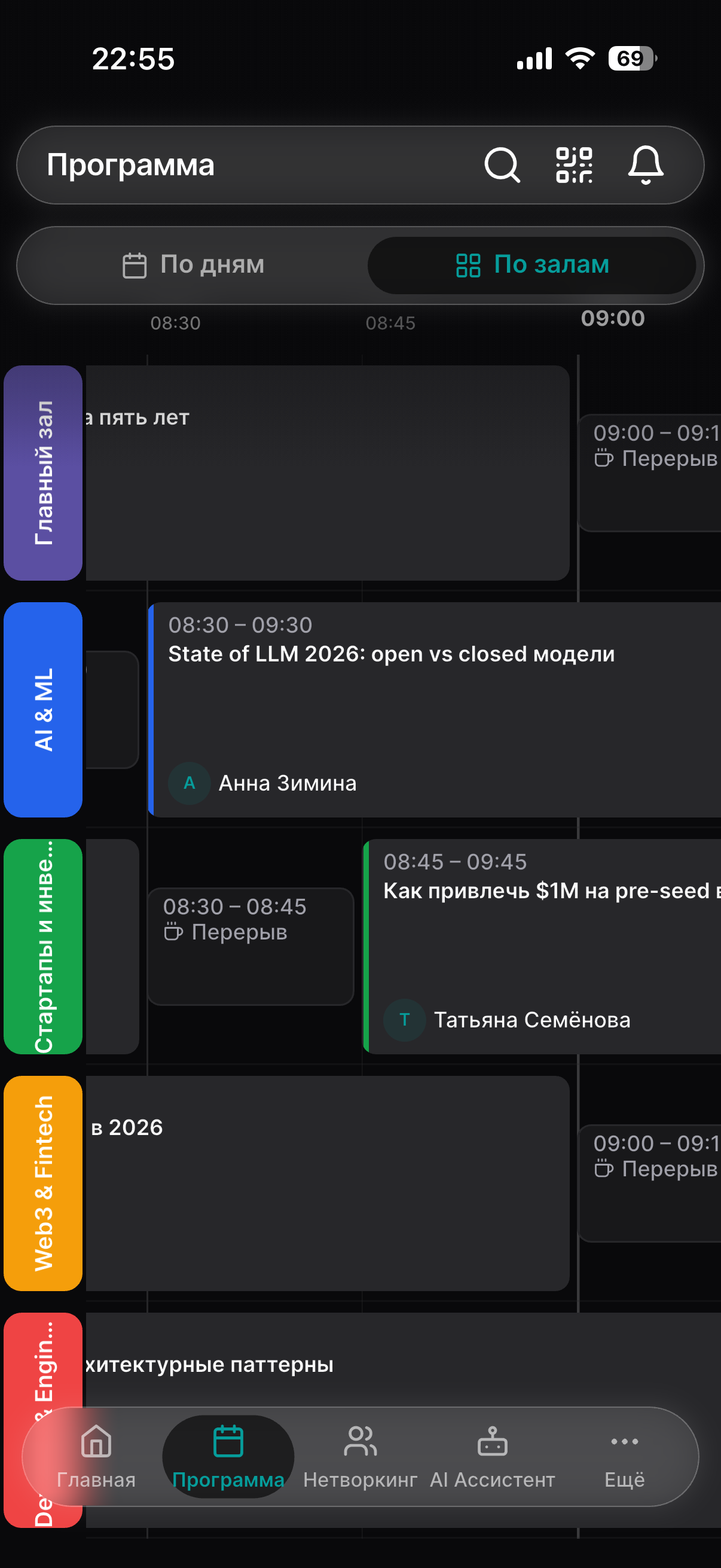 Веб-версия и нативное мобильное приложение с AI-рекомендациями людей и сессий, мессенджером, системой встреч и всей информацией об ивенте.